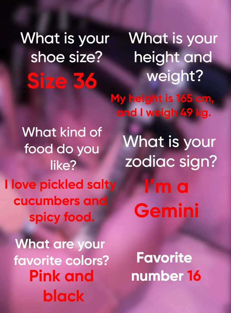 Fetiš stopala, Toples, Ocjenjivanje kurca, Pušenje, Potpetice, Drkanje, Pokazivanje, Masturbacija, Prstenjanje, Najlon, Pušenje, Orgazam, Tittyfuck, Seks Igračke, Show s uljem, Dildo ili vibrator, Ahegao, Analne igračke, Kaubojka, Pseća poza, Spanking